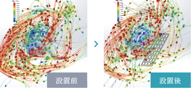エコシートの円形孔は、吸込気流の風量を落とすことなく乱流化させて熱交換直前のファン内での気流滞留を防ぎ、スムーズに気流を熱交換器に送る。(名古屋市工業研究所における気流解析シュミレーション)