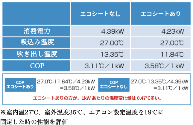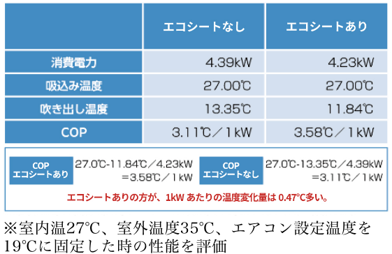 エアコンメーカー「LG電子」における性能評価試験(ISO規格)エコシートを設置した場合、消費電1kWあたりの(吸込-吹出)熱量差が0.47°C多く、効率が13.1%向上していることが分かった。
